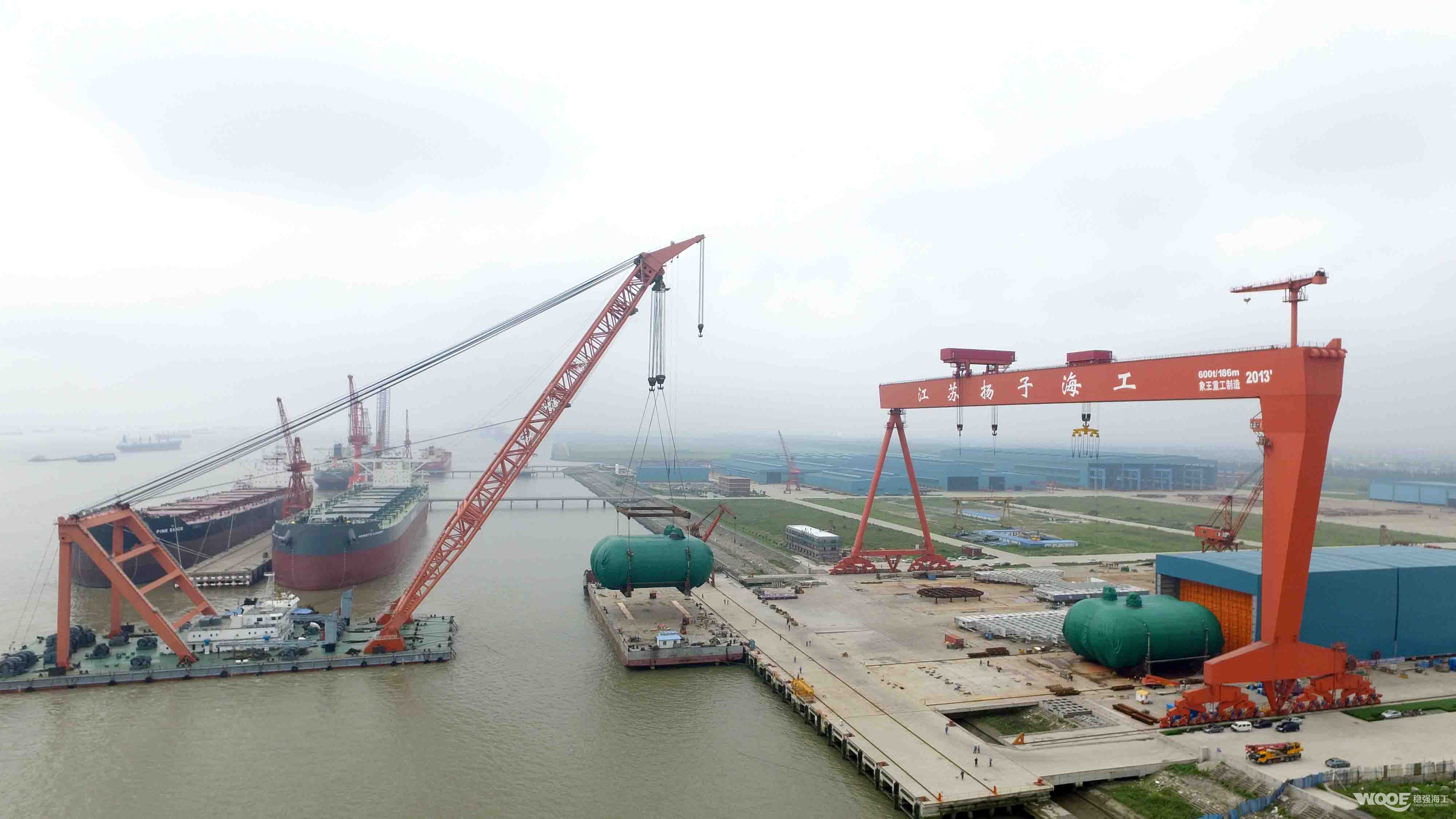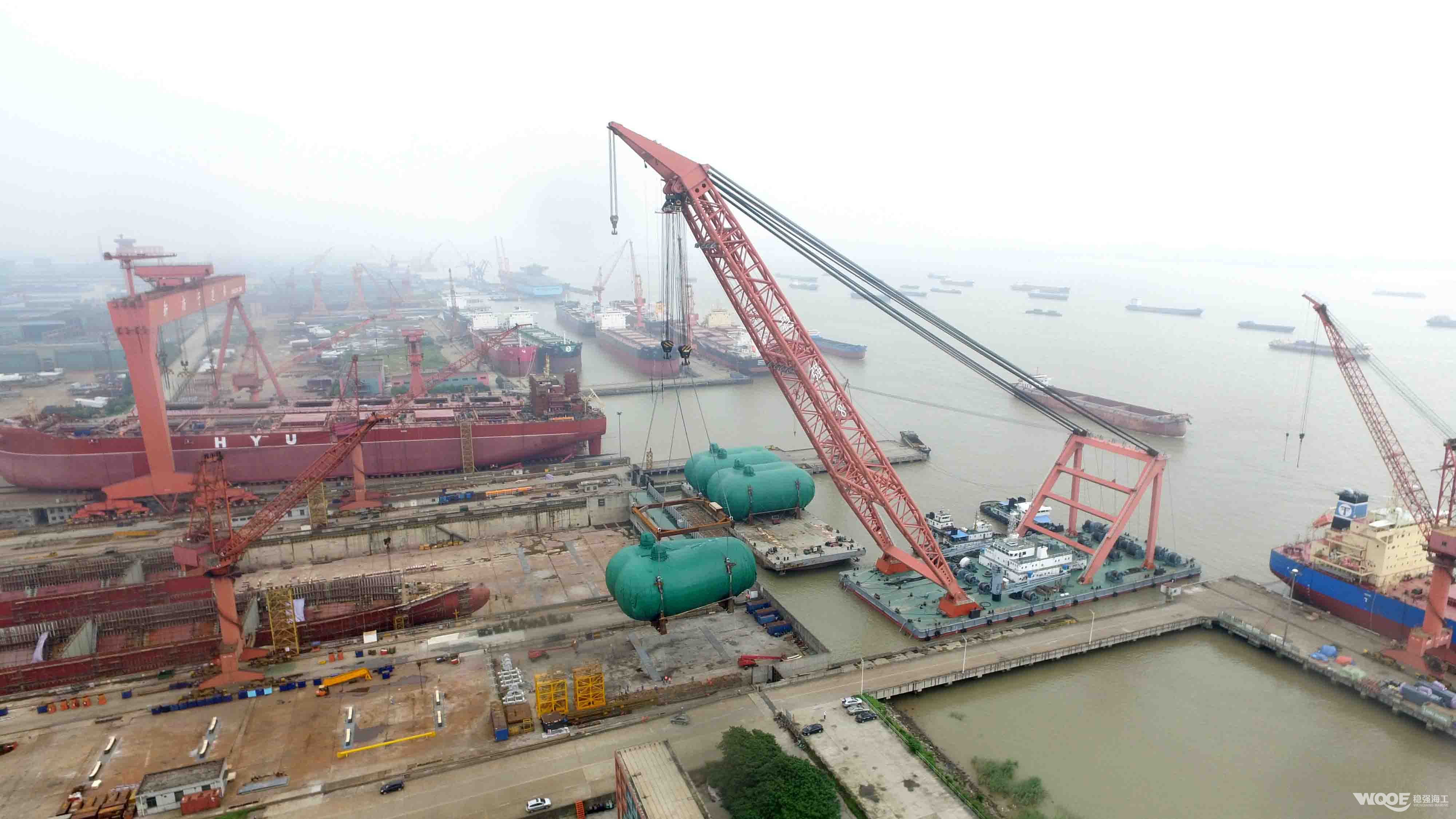 随着扬子江海工码头的鞭炮声,一只巨大的罐体被“稳强8”稳稳吊起,此罐体最终会被安装在27500 CBM LNG船舱内,该船舶为环保型LNG运输船,船甲板配置2个双燃料主机和发电机使用小型LNG罐;此次起吊罐体连吊装锁具最重为950吨,长37.85m直径约25米;经过六天的施工,此次工程安全顺利结束。